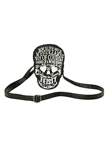Black crossbody bag from Disney with Peter Pan inspired quotes on a heart-eyed skull. Zipper closure.