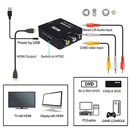 Studio : Alitutumao Publisher : Alitutumao Binding : Electronics Product Description Alitutumao RCA/AV to HDMI to Converter It converts RCA (AV, composite, CVBS) signals into HDMI signals so you can watch your video on a modern TV with HDMI ports. The analog to digital conversion in this module employs 10 bits maximal 162MSPS sampling, black/white level expansion, color transition improvement, dynamic range expansion, blue stretch , auto-detect and auto-convert the composite signal to 1080p(60HZ) output. Making video come alive, delivering the sharpest, most realistic HD visuals available.