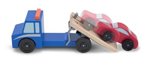 Two-piece wooden vehicle set with flatbed tow truck and car