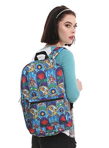 Stained glass print includes Belle, Beast, a rose and castle. Includes exterior zipper pocket, padded back and padded shoulder straps. Polyester Size in inches: 17" x 11" Imported