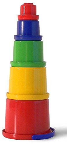 Five colorful cups are fun for stacking or filling with treasures. Largest cup doubles as a bucket with carry handle.