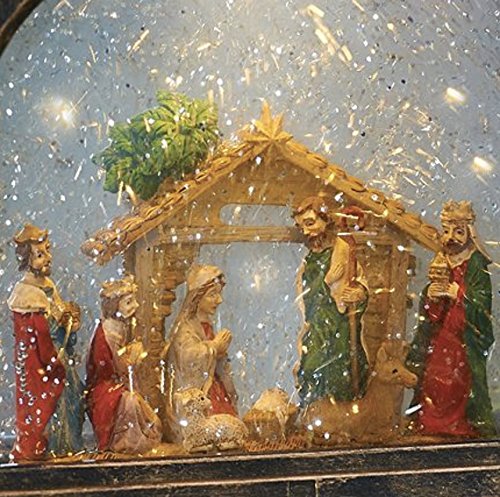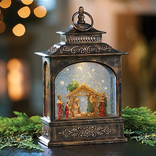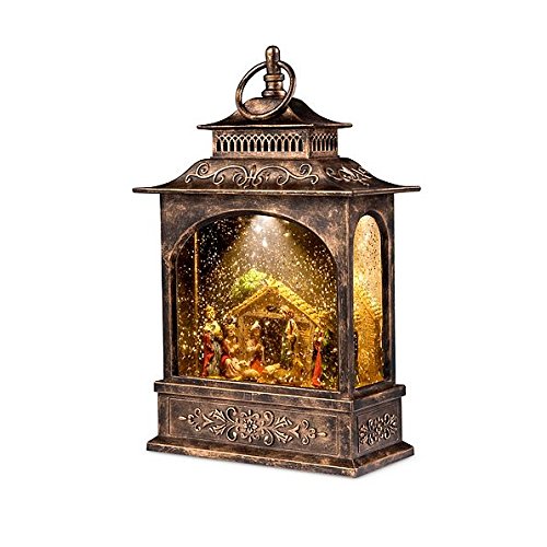 Studio : Improvements Publisher : Improvements Binding : Kitchen Product Description Celebrate Christmas with the Christmas Nativity Scene Snow Globe Lantern. Sure to become a family heirloom, this creche features a silent, hidden motor that moves the gold glitter around in a perpetual snow-globe. A 3mm warm white LED lights up the scene. Timer function for 6 hrs. on/18 hrs. off. 144 hours continuous run time; 720 hours on timer function. Durable lantern has the look of patina on copper. Indoor use only. Plastic, resin, water, metal. Requires 3 C batteries, not included. 0