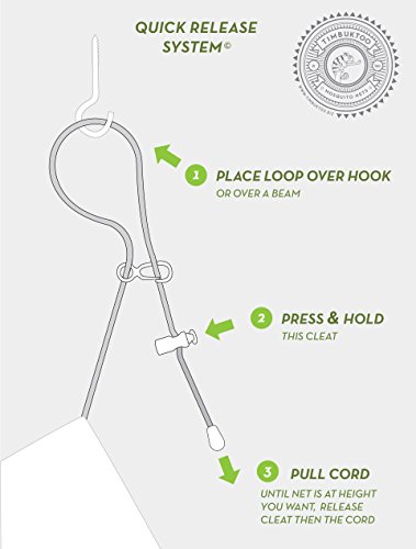 QUCK INSTALLATION - so simple, a toddler could do it, with the pre-installed hanging kit, it only takes seconds to hang and adjust our net. A quick twist collapses the pop-open-hoop, making our king size net small and compact to fit easily in your overhead luggage in the complimentary stuff sack. No more messing with untying knots.
