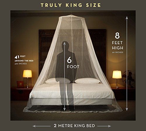 GENEROUS SIZING - Our Luxurious King Size Mosquito Net fits all beds from Single, Double to King. Its the biggest net sold on Amazon. Our soft & light fabric has tiny holes [256 holes per square inch] which keeps mosquitos and other insects out, yet allows a cool breeze in - for comfortable, natural protection and a peaceful night's sleep.
