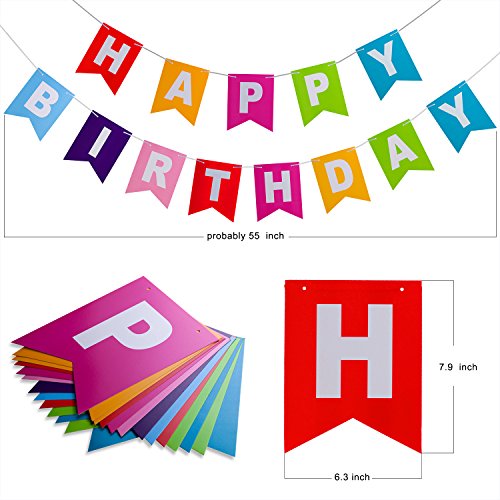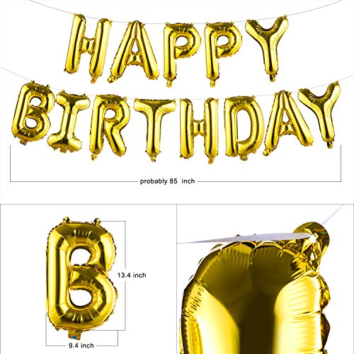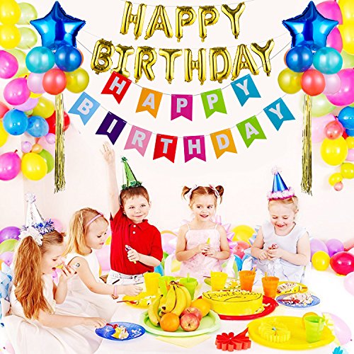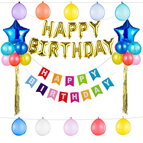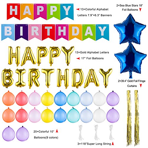 - Birthday Party Decorations Includes 13 Gold Alphabet Letters 17" happy birthday Foil Balloons, 13 Colorful Alphabet Letters 7.9”×6.3” Birthday Flag Banners, 2 Sea Blue Stars 18” Foil Balloons, 20 Colorful 10” Balloons(9 colors), 2×39.4” Gold Foil Fringe Curtains.