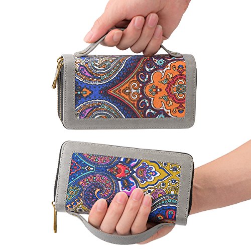 Organize your things securely and stylishly with the Te-Rich Women's Printed Zip Wallet. Featuring a colorful pattern, this wallet has a zip closure that provides both secure storage for your valuables and easy access when you're in a hurry and a zipper coin pocket. There is a variety of inner pockets to keep everything in place, including two clear ID windows, nine card slots, two bill pockets, one cell phone pocket and one zipper pouch to stash your coins.