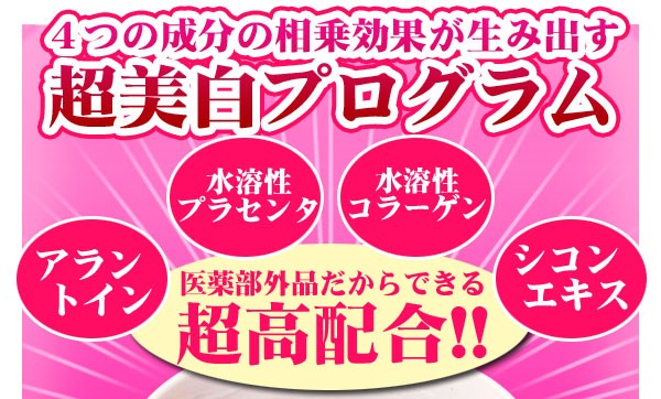 | 成分 | 有効成分:アラントイン、水溶性プラセンタエキスその他の成分:水溶性コラーゲン、シコンエキス、プロピレングリコール、グリセリン、カルボキシビニルポリマー、水酸化ナトリウム、パラオキシ安息香酸エステル、精製水、カルミン・コンジョウ処理雲母チタン、香料 |