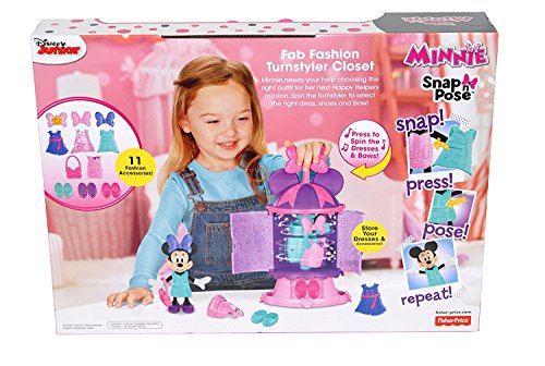 -. Binding : Kitchen -. Brand : Fisher-Price -. Color : Purple -. EAN : 0887961581683 -. Feature : Spinning closet playset with fun sound effects / Everything stores neatly inside; Spin the dresses and bows / Includes 5-inch (12.7cm) Minnie Mouse Snap N' Pose fashion figure / Snap on a dress and see Minnie strike a pose / Comes with three dresses, a pair of shoes, a bow and a purse -. IsAdultProduct : 0 -. Label : Fisher-Price -. Manufacturer : Fisher-Price -. MPN : FPD23 -. PackageQuantity : 1 -. PartNumber : FPD23 -. ProductGroup : Home -. ProductTypeName : HOME -. Publisher : Fisher-Price -. Studio : Fisher-Price -. Title : Disney Junior Minnie's Fab Fashion Turnstyler Closet Snap 'n Pose With 11 Fashion Accessories -. UPC : 887961581683
