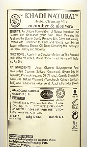 -. Feature : Brand New Genuine Khadi Natural Product in Export Packaging. Customer Satisfaction Guaranteed. / Unique formulation of natural ingredients that cleanses and refreshes your skin. / Deep cleansing milk penetrates the skin to gently remove dirt, grime and makeup. / Enriched with cucumber to cool and soothe your skin and to remove excess oil, deep cleansing leaves your skin clean, healthy and glowing. / Made in India.