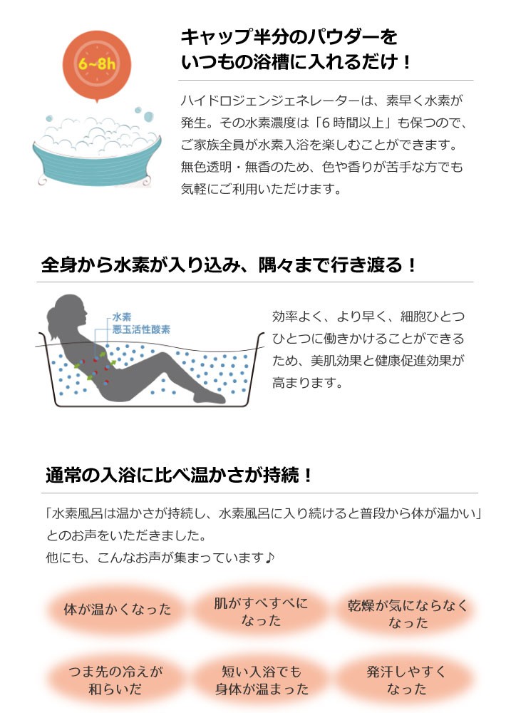 すばやく水素が発生し、6~8時間バスタブの中で水素が発生し