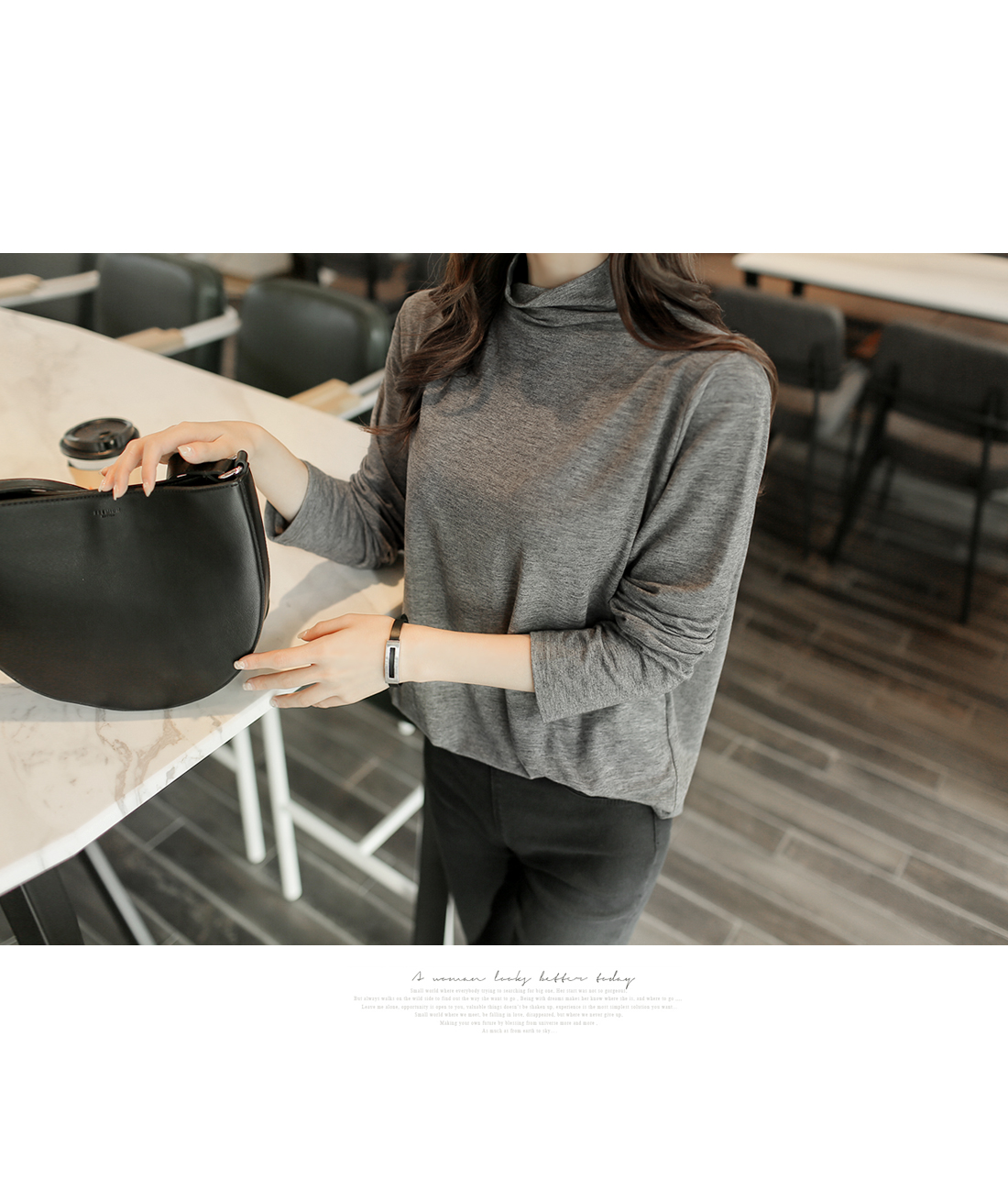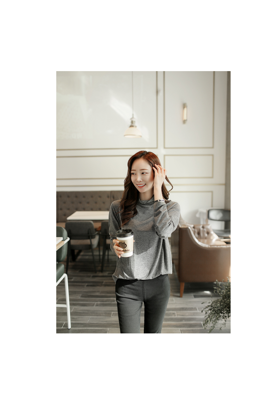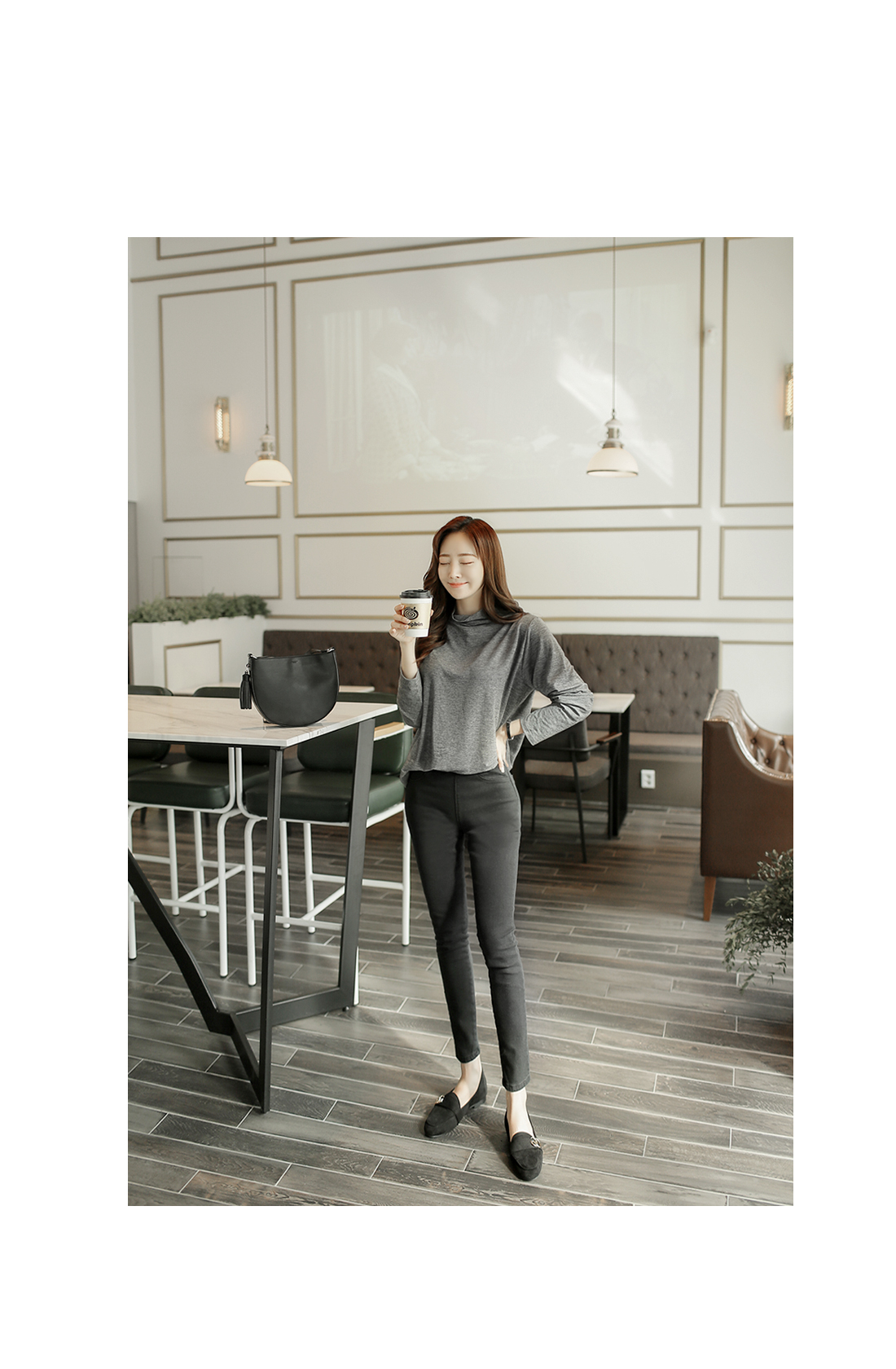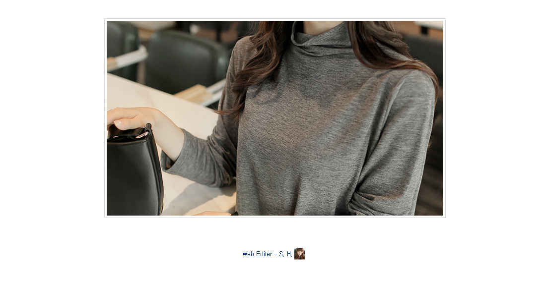 목선을 살짝 덮어주는 하이 네크라인이며,