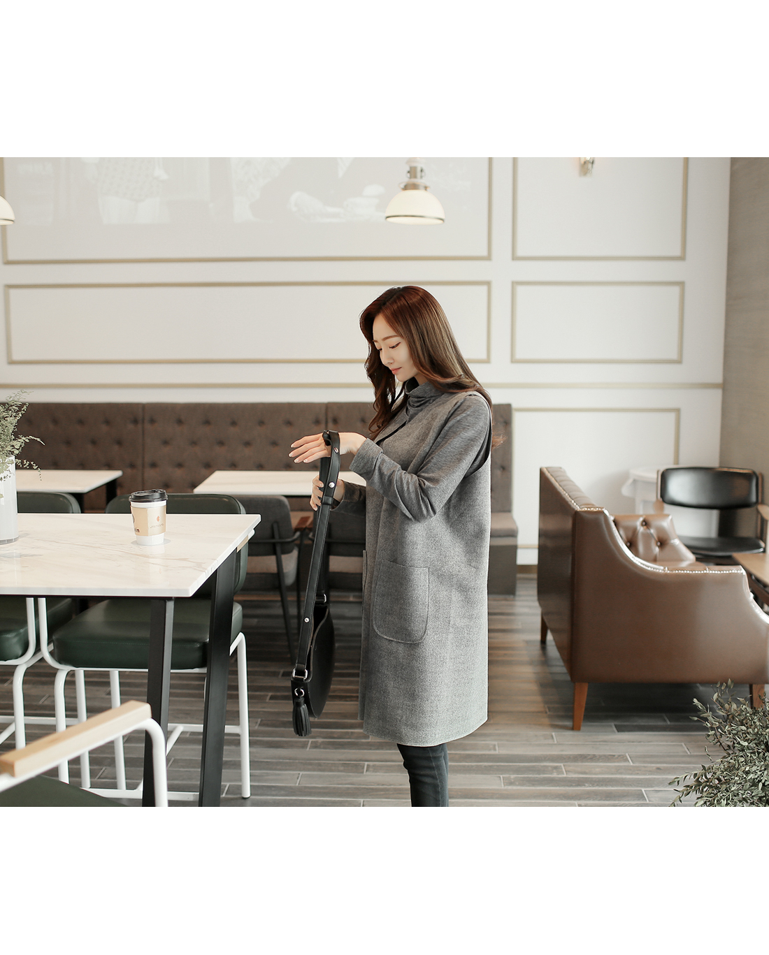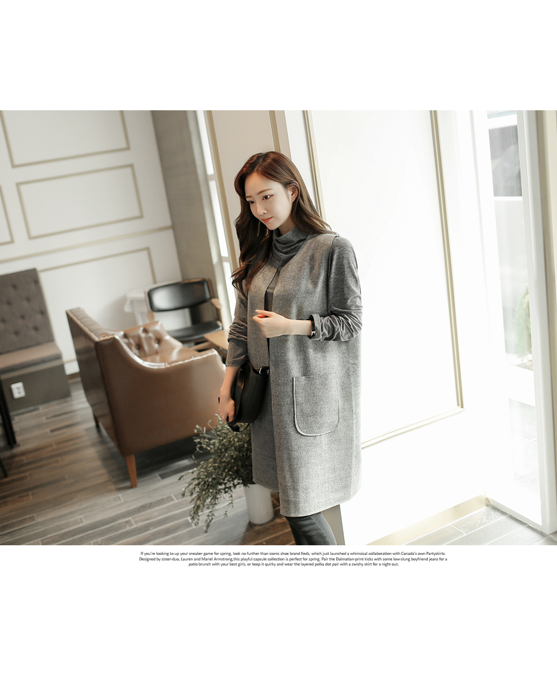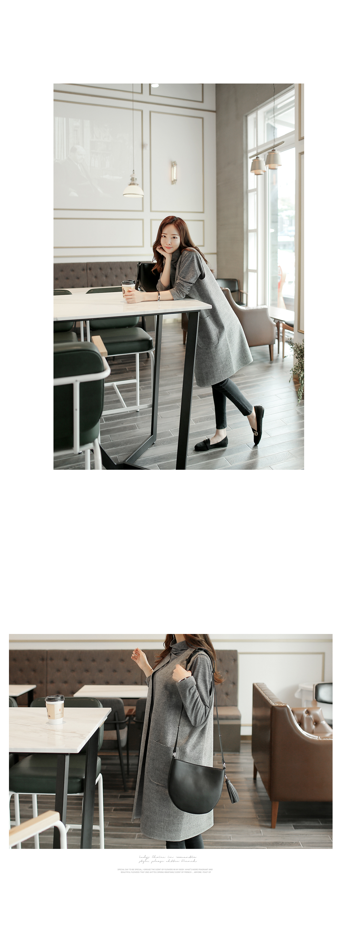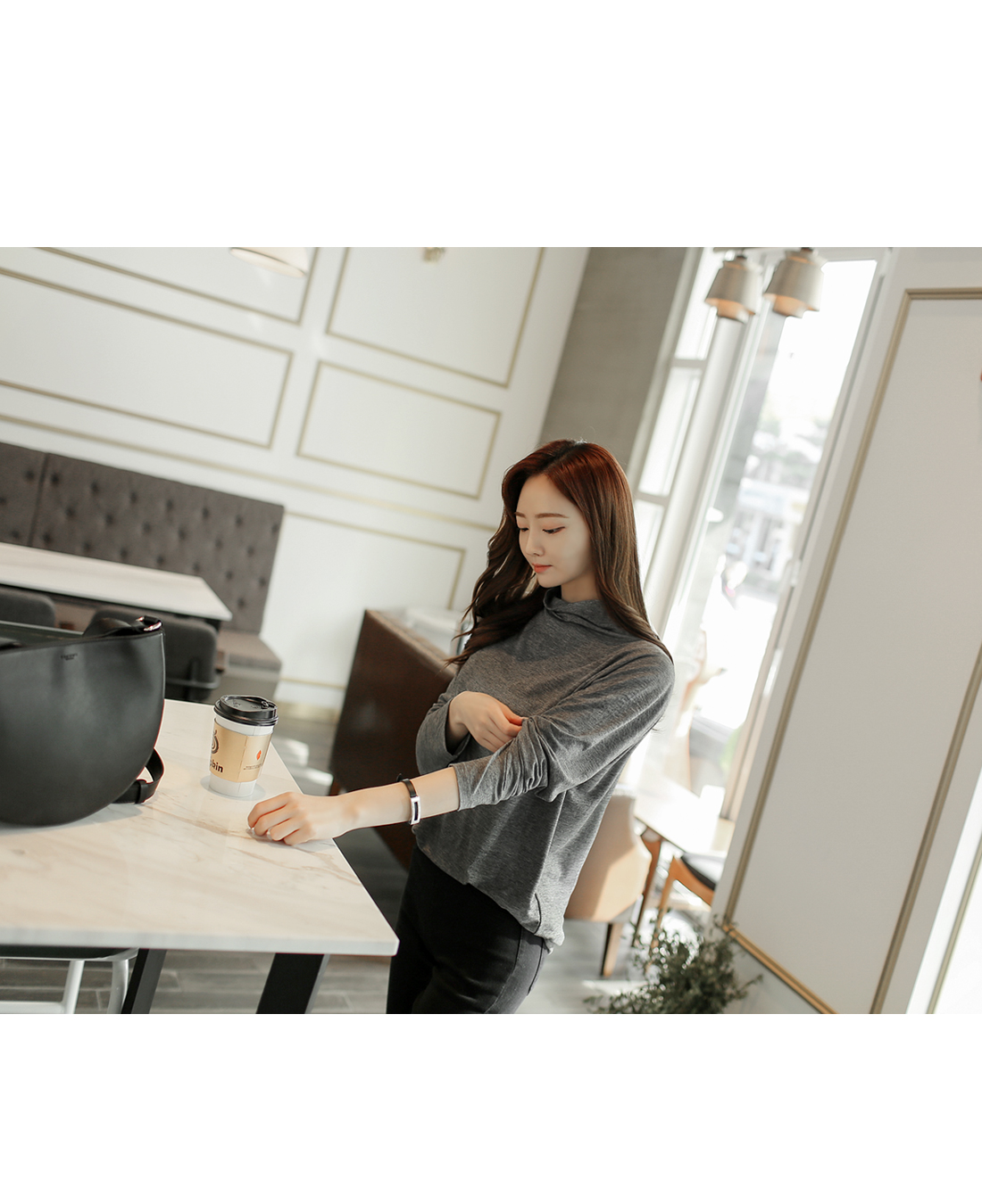 목선을 살짝 덮어주는 하이 네크라인이며,