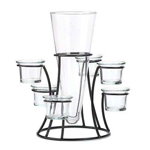 Studio : Zingz Thingz Publisher : Zingz Thingz Binding : Kitchen Product Description Place fresh flowers in the vase and watch as their beauty intensifies with the help of glowing candlelight. The black metal frame of this fantastic accent piece holds a tapered glass vase surrounded by eight glass candle cups waiting to be filled, creating a dramatic display. 0