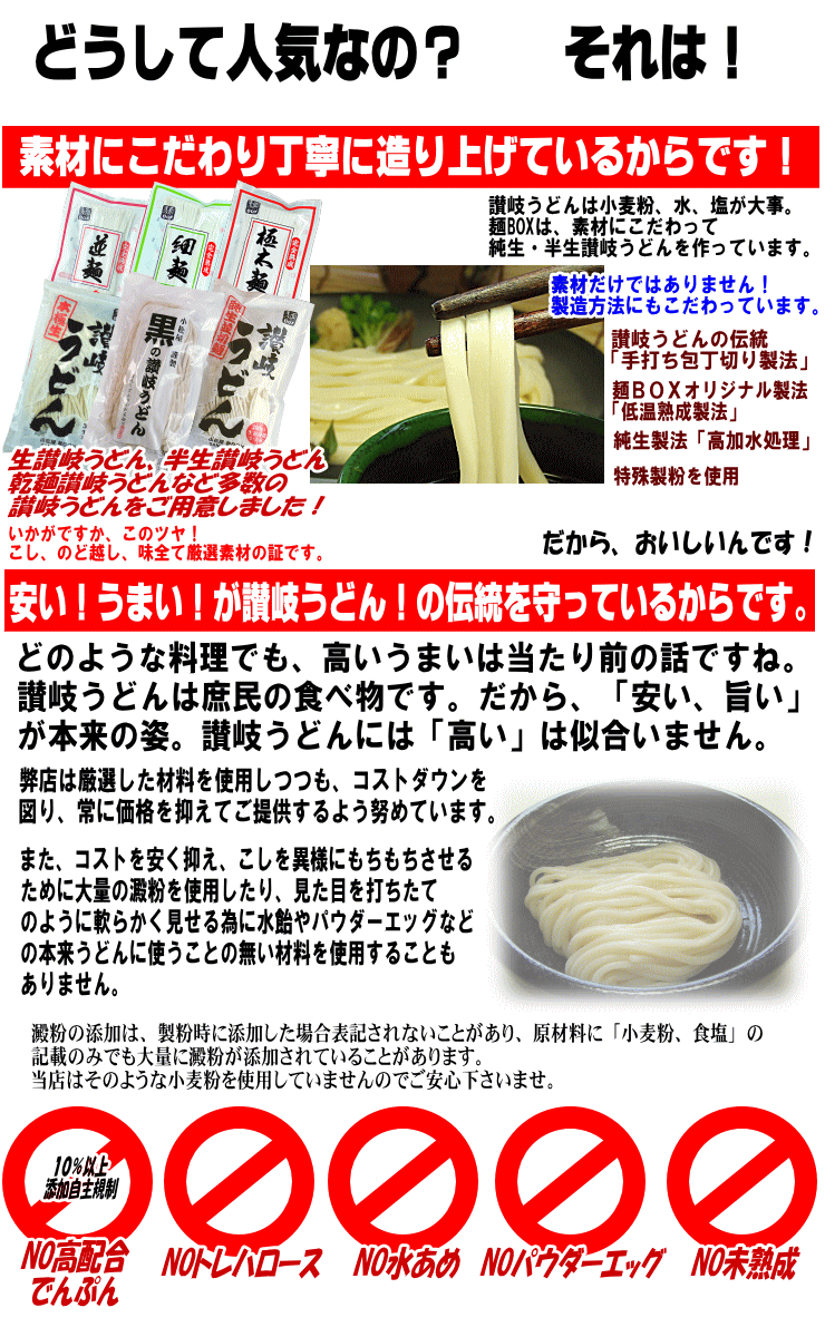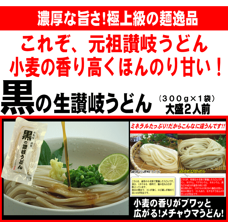 | 調理方法 | 多目のお湯でうどんを茹でた後、流水でもみ洗いをして表面のぬめり、塩分を 取り除き、器に盛ります。 |