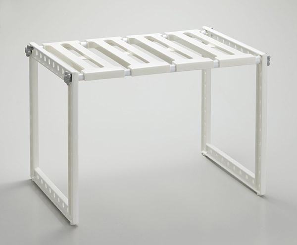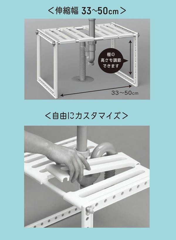 洗面台下の収納に!!排水トラップを避けて棚がつくれます。 製造国:日本 素材・材質:フレーム:スチロール樹脂棚板・メネジ:ポリプロピレンパイプ:PPコーティングスチールパイプ(樹脂部:ABS樹脂) 重量:762g 仕様:耐荷重:5kg棚板:4枚タイプ組立式取扱説明書付き(パッケージに記載有) ※サプライヤー直送品 ご注文後2~3営業日後の出荷となります【商品名】Belca(ベルカ) VIVO Smart 洗面下フリーラック 伸縮タイプS SSR-SX ホワイト