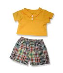 -. Feature : Teddy bear outfit / yellow polo top / plaid pants / fits 15 inch plush / 2 piece outfit
