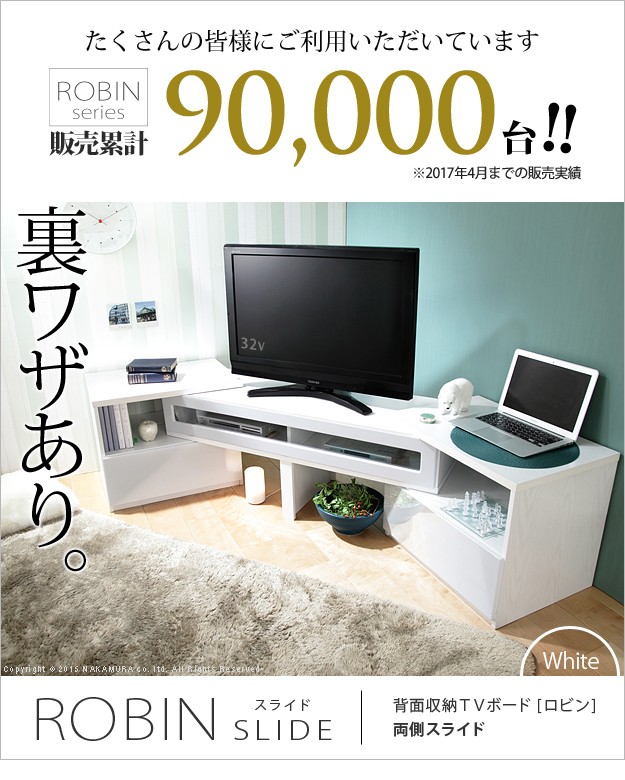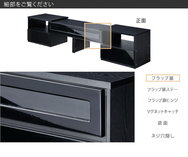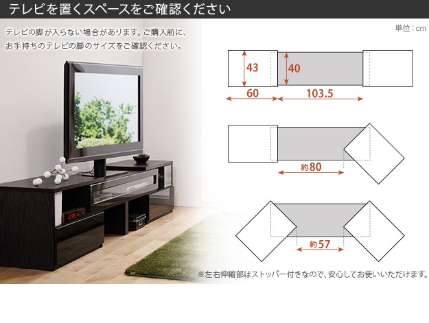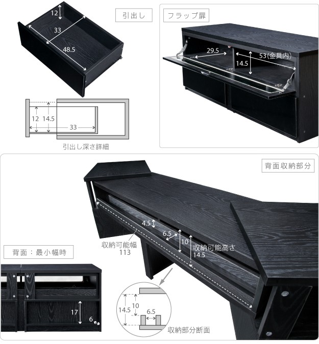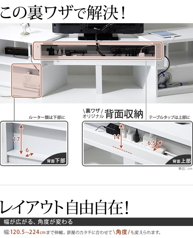両サイドのボードが伸縮・スイングする背面収納のTVボードです。伸縮やスイングで形を変えられるので壁前、コーナーなどお好みの場所に配置できます。背面のコード収納スペースでコンセント類や配線はスッキリ。前面収納はフラップ扉棚、引き出し2杯、オープン棚(スライド時)と大容量。DVDはもちろんゲーム機や通信機も収納できます。天板耐荷重は約30kg(引出し・棚は各約5kg)です。
