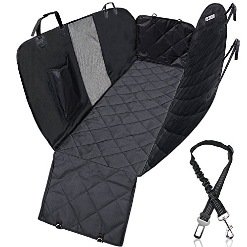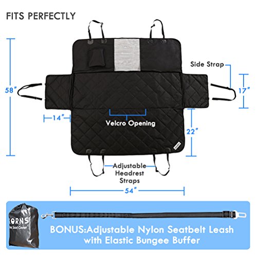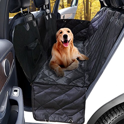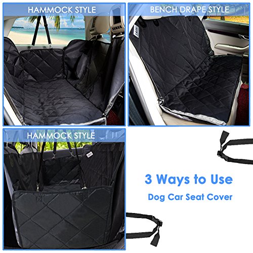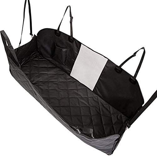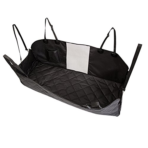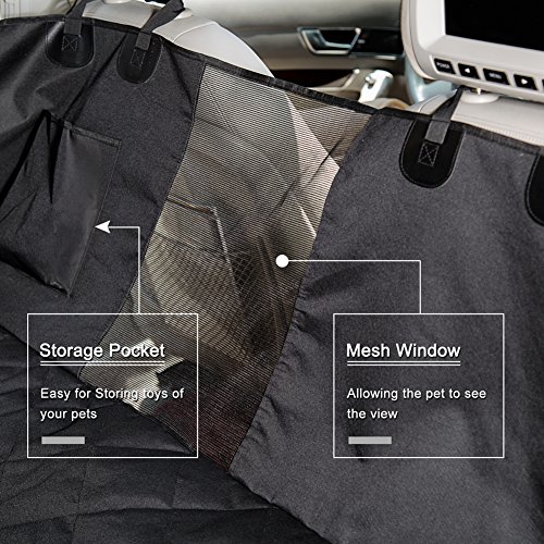 -. Feature : [Breathable Mesh Viewing Window & Storage Pocket] This hammock-convertible car cover for rear seat has a mesh window barrier that allows the pet to see the view to the front seat. This feature also lets air through the dog car seat protector hammock for a more relaxing ride. Besides, there is one pockets included for easy storing of toys which would make pets feel relax and happy. / [Easy Installation & Use & Cleaning up] Just slip it on, buckle the straps, secure the tube anchors and you're good to go. Wet spots don't get absorbed and can be wiped off with a cloth. This needs only occasional washing and is machine washable. The seat cover for pets prevents any scratches, claw marks, hair or other damage to your expensive back seat bench. / [Ensure Your Dog Safe] The dog protector car seat cover is secured in place by extra flaps, seat anchors and non-slip silicone backing. The hammock side flaps can protect your car door from scratch, hair. Also be easier for your dog to get in or out of car. The nonslip backing design and seat anchors can prevent pet seat cover from sliding around. With the built-in velcro openings for your seatbelts ,the hammock car seat cover ensure your dog safe on the way. / [Water Resistant & Comfortable Material] The dog hammock seat cover for back seat is made of four layers of durable and breathable materials as showed on pictures. The PU coating makes this dog seat protector hammock waterproof, easy to clean, and luxurious-looking. / [Max Adjustability & Lifetime Warranty] The dog rear seat cover hammock measures 54 inches wide and 58 inches long. Fits most cars and SUVs with adjustable straps and bands. Being so sure about the top quality and excellent performance of our heavy duty pet seat hammock style cover, we promised that offering you 1 year warranty and 45 days money back of complete satisfaction. With nothing to lose, get the "ticket" for a smooth ride with your pup now!