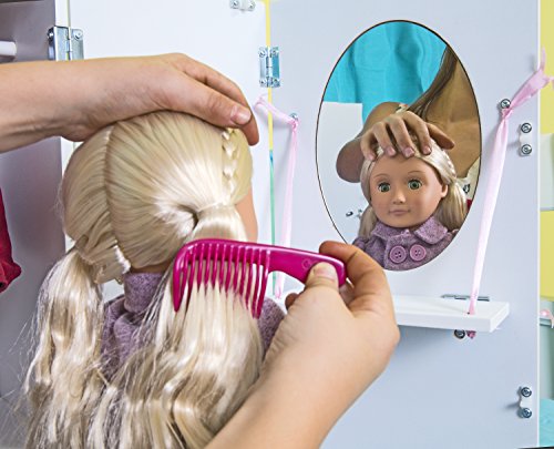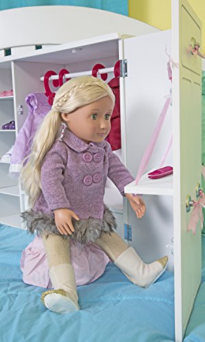 Holds little outfits and big dreams. Extends dress-up playtime. Includes: 1 wooden wardrobe with vanity and 1 stool.