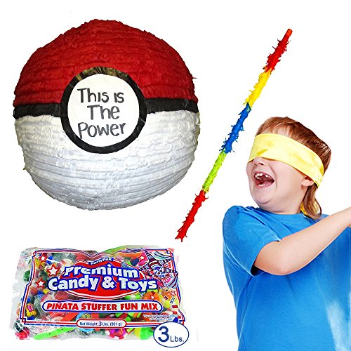 Studio : Pinatas Publisher : Pinatas Binding : Toy Product Description Kit includes 1 pinata, 3 lbs. of candy, 1 buster stick and 1 bandana. Pinata measures 13" high x 13" long x 13" deep. Comes with strong cable tie at the top for hanging pinata and opening for adding fillers. Pinata makes a fun party game, unique decoration centerpiece and exclusive photo prop for Pokemon themed parties. Pinata filler includes 3 pounds of assorted candy, enough for 10 guests. 18" long pinata buster stick is made of wood and is decorated with fringe-cut tissue paper in assorted colors. Bandana comes in assorted colors (our choice please), measures 20" by 20" and is 100% polyester. Use bandana to blindfold player before hitting pinata. 0