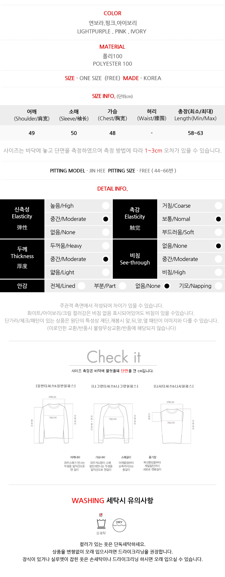 ![]() MD COMMENT 러블리한 매력이 느껴지는 부클티를 소개해요 앞, 뒤 v넥으로 가녀린 목선을 연출해주구요 여유있는 핏감과 와이드한 소매라인으로 여리여리해 보이는 제품이에요 블링블링한 펄사가 들어간 부클 소재로 밋밋함을 덜어 줄 뿐만 아니라 룩의 퀄리티를 UP! 시켜 주었구요 적당한 기장감에 하의 인 앤 아웃이 예쁘며 기본 스키니부터 숏팬츠, 스커트 등 다양한 하의와 스타일링해 보실 수 있어 스타일링이 어렵지 않아 좋답니다 DETAIL TIP 폴리100% 소재로 제작되었구요 신축성은 없지만 활동하시는데 큰 불편함은 없구요 안감이 따로 없으나 비침 없는 스타일로 단독 연출할시에도 부담없이 착용 가능해요 SIZE TIP 원 사이즈 제품이며 44~66반 사이즈까지 프리하게 착용할 수 있는 아이템이에요 착용컬러 : 연보라 착용모델 : Jin Hee ![]() ![]() ![]() ![]() ![]() ![]() ![]() ![]() ![]() ![]() ![]() ![]() |