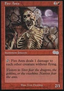 -. Binding : Toy -. Brand : Magic: the Gathering -. Color : Red -. Edition : Urza's Saga -. Feature : A single individual card from the Magic: the Gathering (MTG) trading and collectible card game (TCG/CCG). / This is of Uncommon rarity. / From the Urza's Saga set. -. IsAdultProduct : 0 -. Label : Wizards of the Coast -. Manufacturer : Wizards of the Coast -. MPN : USCIDU-20-Y-34251-507-FYY-LSJ -. PackageQuantity : 1 -. PartNumber : USCIDU-20-Y-34251-507-FYY-LSJ -. ProductGroup : Toy -. ProductTypeName : TOYS_AND_GAMES -. Publisher : Wizards of the Coast -. Studio : Wizards of the Coast -. Title : Magic: the Gathering - Fire Ants - Urza's Saga
