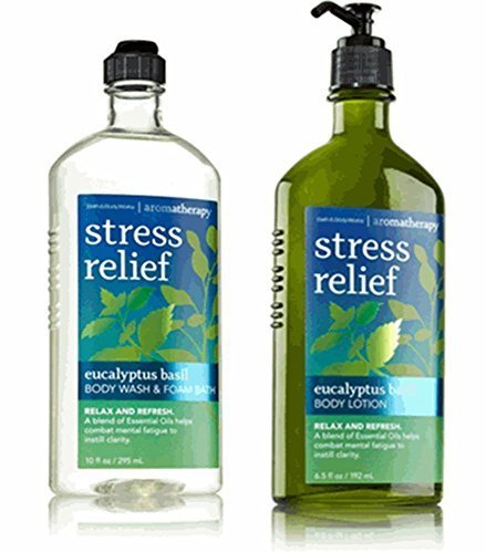 -. Binding : Misc. -. Brand : Bath and Body Works -. Feature : LOOKING FOR THE PERFECT GIFT SET for that aromatherapy lover? Look no further. Bath & Body Works creates the most wonderful scents that will melt your stress away! / A BLEND OF EUCALYPTUS essential oils and basil that helps combat mental fatigue to instill clarity / EUCALYPTUS BASIL WASH & FOAM BATH: This fast-foaming body wash is infused with soothing skin conditioners, while an aromatherapy blend of essential oils and natural ingredients benefits body, mind & mood. Breathe deeply for best results. / EUCALYPTUS BASIL LOTION: This ultra-creamy, nourishing body lotion is formulated to give skin long-lasting moisture while an aromatherapy blend of natural ingredients and essential oils benefits body, mind & mood. Breathe deeply for best results. / YOU WILL RECEIVE 1 - Eucalyptus Basil Body Lotion & 1 - Eucalyptus Basil Body Wash & Foam Bath in your purchase -. IsAdultProduct : 0 -. MPN : B004XU9R48 -. PackageQuantity : 5 -. PartNumber : B004XU9R48 -. ProductGroup : Beauty -. ProductTypeName : BEAUTY -. Title : Bath & Body Works Aromatherapy Stress Relief Eucalyptus Basil 2 piece Gift Set