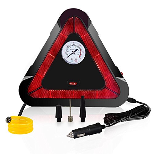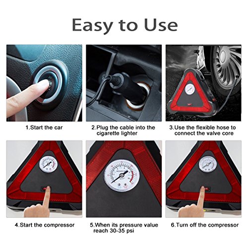 POWERFUL YET COMPACT: Max pressure 150 PSI. The tire air compressor inflates a standard mid-sized car tire from 0-30 PSI in 5 minutes. Compact design is user-friendly for storage in your trunk.
