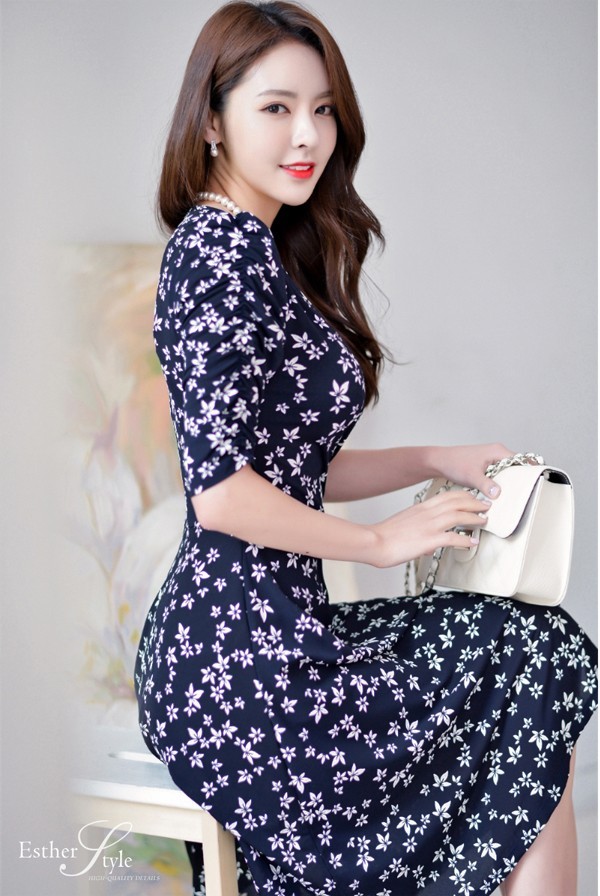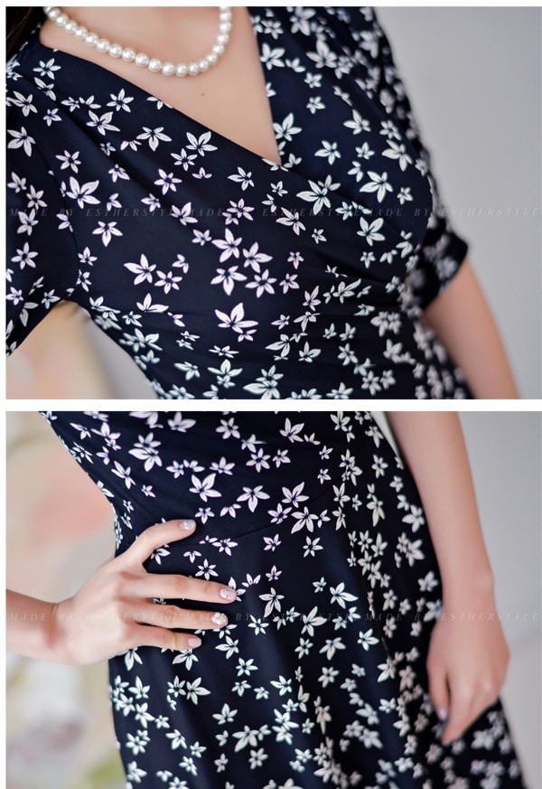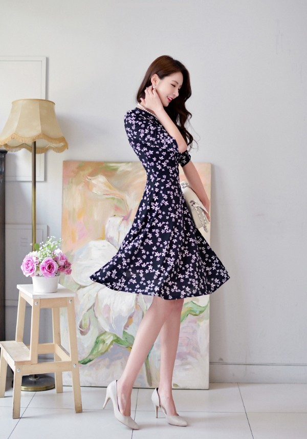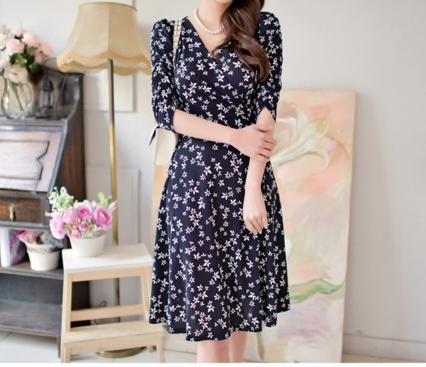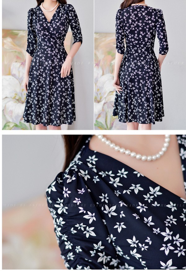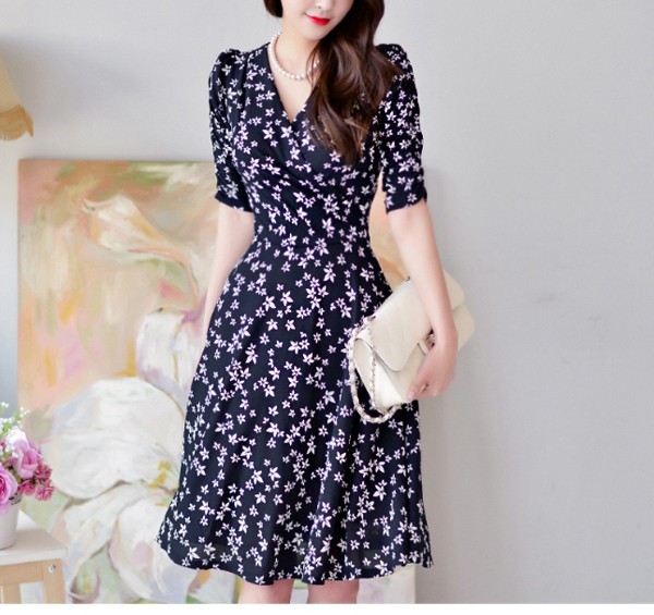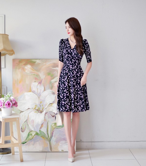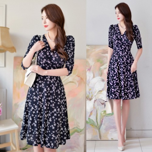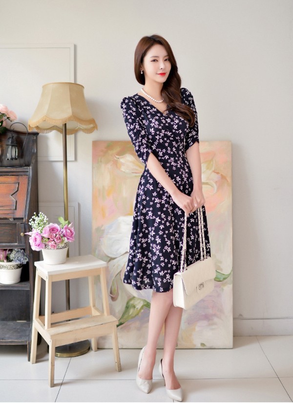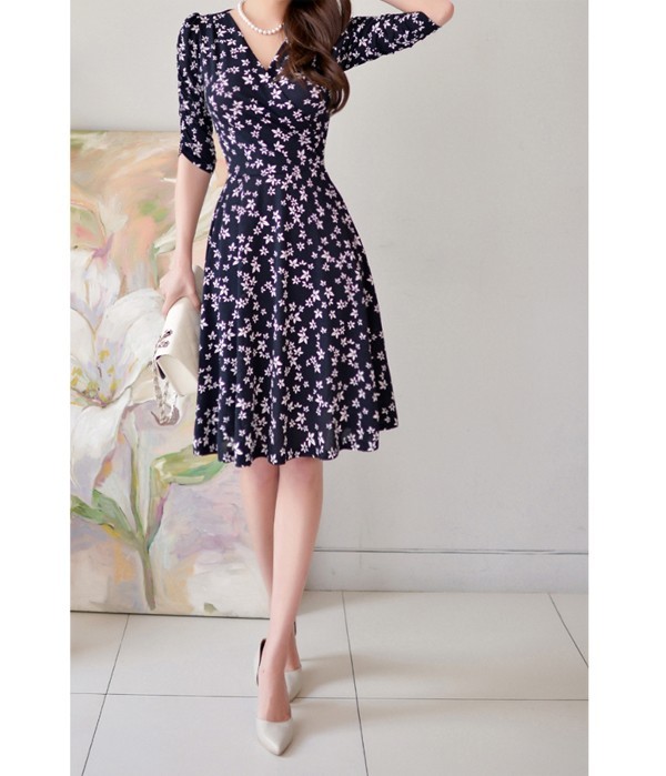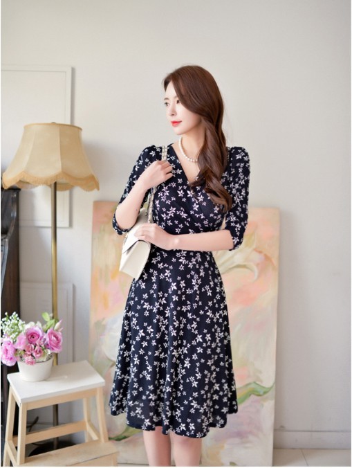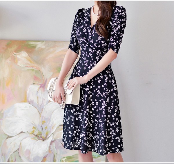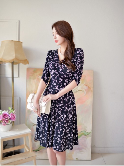 小花柄プリントの膝丈フレアワンピース。袖のシャーリングデザインが腕を細く綺麗に魅せてくれる♪上品なフラワープリントで大人かわいく着こなせるワンピ♪