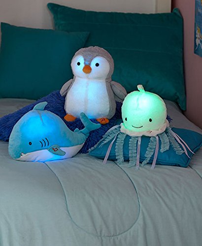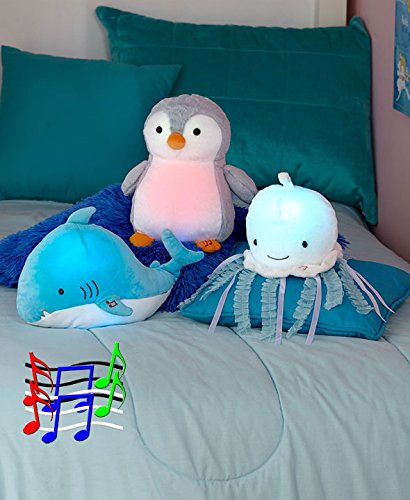 Studio : Generic Publisher : Generic Product Description Press the music note on the Musical Glowing Sea Animal for a soothing show children will enjoy. Perfect for bedtime, this cozy plush plays serene music with color-changing lights. Colors change from shades of red to blue to green. Plays for about 4 minutes before shutting off. On/off switch. Requires 3 "AAA" batteries. Icy the Penguin, 9"W x 7"D x 10-1/2"H. Bubble the Jellyfish, 7"W x 7-1/2"D x 16"H. Chomp the Shark, 14-1/2"W x 8"D x 9"H. Polyester and plastic with cotton fill. Penguin and Shark, for ages 12 months and up. Jellyfish, for ages 18 months and up. Plays gentle music with soothing lights Jellyfish can be hung Details: Icy the Penguin, 9"W x 7"D x 10-1/2"H Bubble the Jellyfish, 7"W x 7-1/2"D x 16"H Chomp the Shark, 14-1/2"W x 8"D x 9"H Polyester and plastic with cotton fill Penguin and Shark, for ages 12 months and up Jellyfish, for ages 18 months and up Battery operated 0