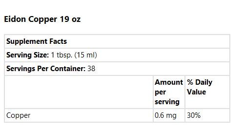 -. Binding : Health and Beauty -. Brand : Eidon -. EAN : 0640923000055 -. Feature : Eidon -. Label : Eidon -. LegalDisclaimer : Unless otherwise noted, this item has not been evaluated by the United States Food and Drug Administration. It is not approved to diagnose, treat, cure or prevent disease. -. Manufacturer : Eidon -. Model : 640923000055 -. MPN : 640923000055 -. NumberOfItems : 1 -. PackageQuantity : 1 -. PartNumber : 640923000055 -. ProductGroup : Health and Beauty -. ProductTypeName : HEALTH_PERSONAL_CARE -. Publisher : Eidon -. Size : 19 oz -. Studio : Eidon -. Title : Eidon Ionic Minerals - Copper Liquid - 19 oz. -. UPC : 640923000055