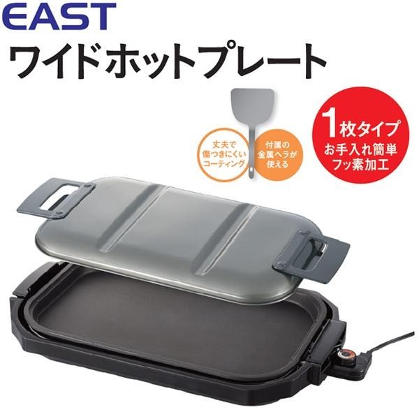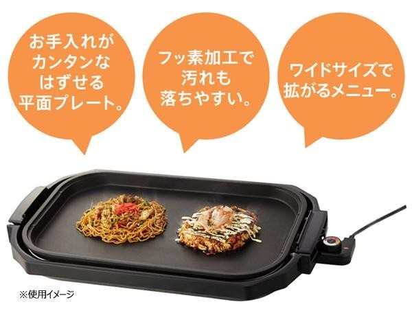 ご家族みんなで楽しめるワイドサイズのホットプレートです。強力1300Wのハイパワーで美味しく焼けます。プレートは1枚タイプで簡単に取り外しでき、汚れの落ちやすいフッ素加工でお手入れ簡単♪付属の金属ヘラが使える丈夫で傷つきにくいコーティングを施しています。 |