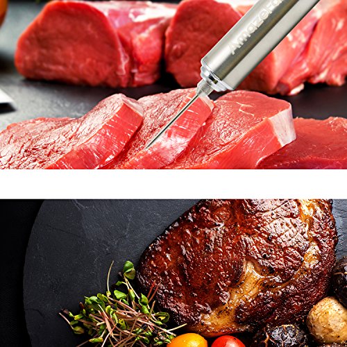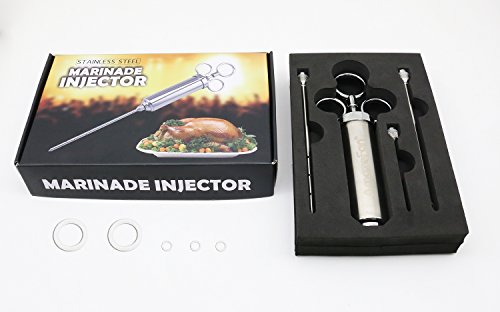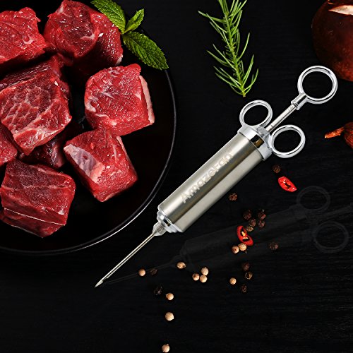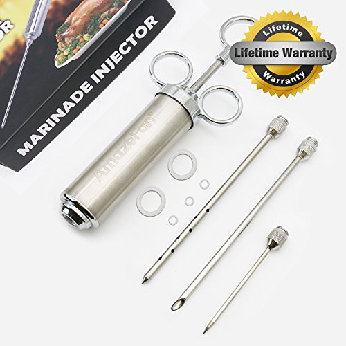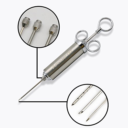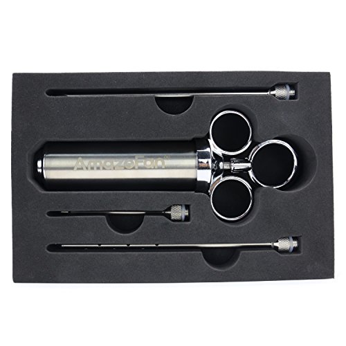 AmazeFan® Seasoning Injector/Marinade Injector With the new and improved 2 oz. seasoning injector You can now add flavor and zest to all your favorite foods! Your grilling and cooking experience will never be the same As you can inject large pieces of meat. poultry and fish with spices, wine, liquor and all your favorite bottled marinades. FDA certificated and made from high quality food grade stainless steel. The injector includes two 6" and one 3" needle. The attachment with 12 holes allow for injecting liquid seasoning or stock deep into your meat to ensure tenderness and the juiciest of flavor. The attachment with the larger hole at the end is perfect for thicker marinades, mincing, and herbs for best results in maximum flavor. The third needle is 3" and is for a more precise injection and for smaller cuts of meat. 0 |