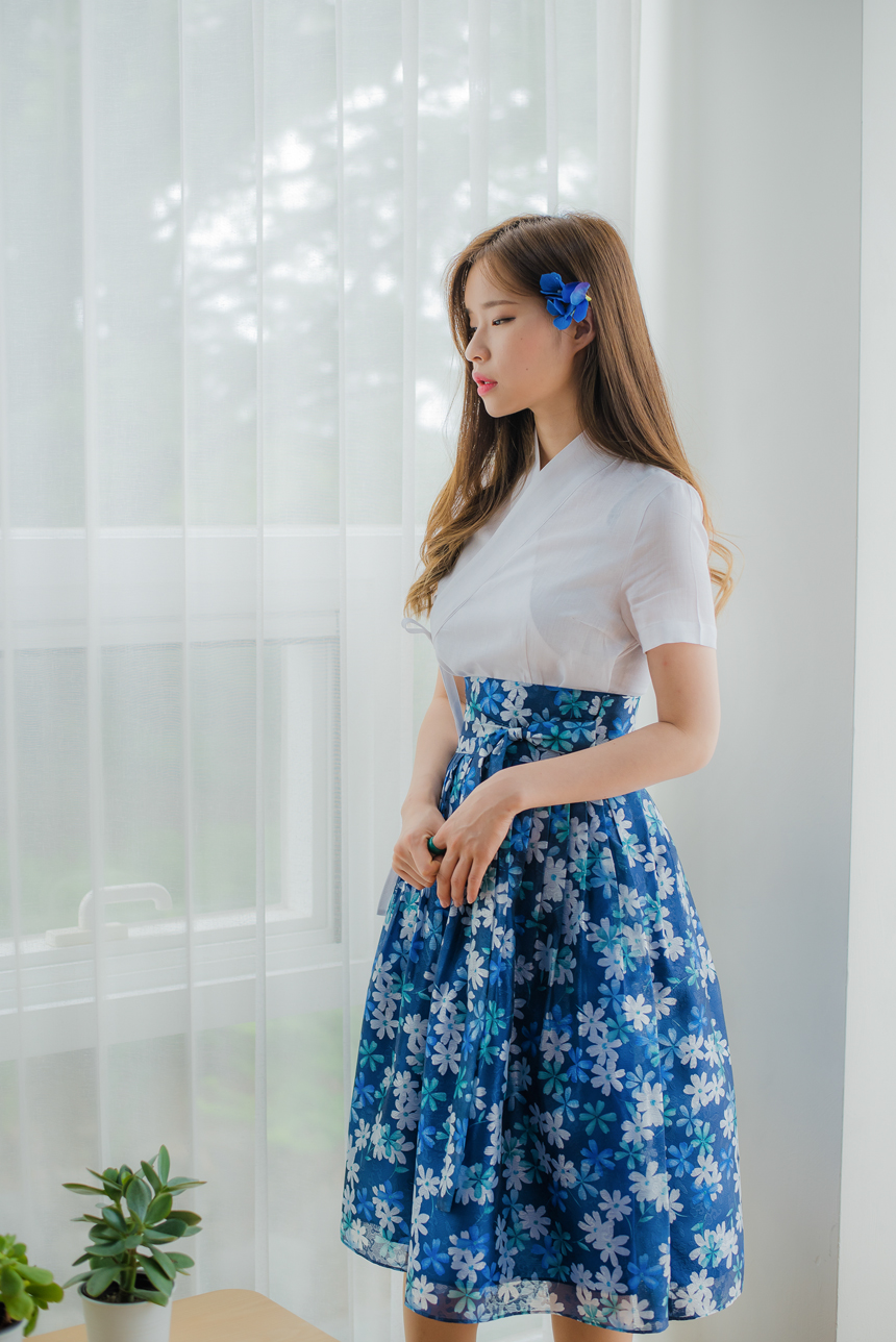 시원하고 청명한 파랑바탕에 블루,청록,화이트 꽃들이 그려져있는 여름용 허리치마 입니다.