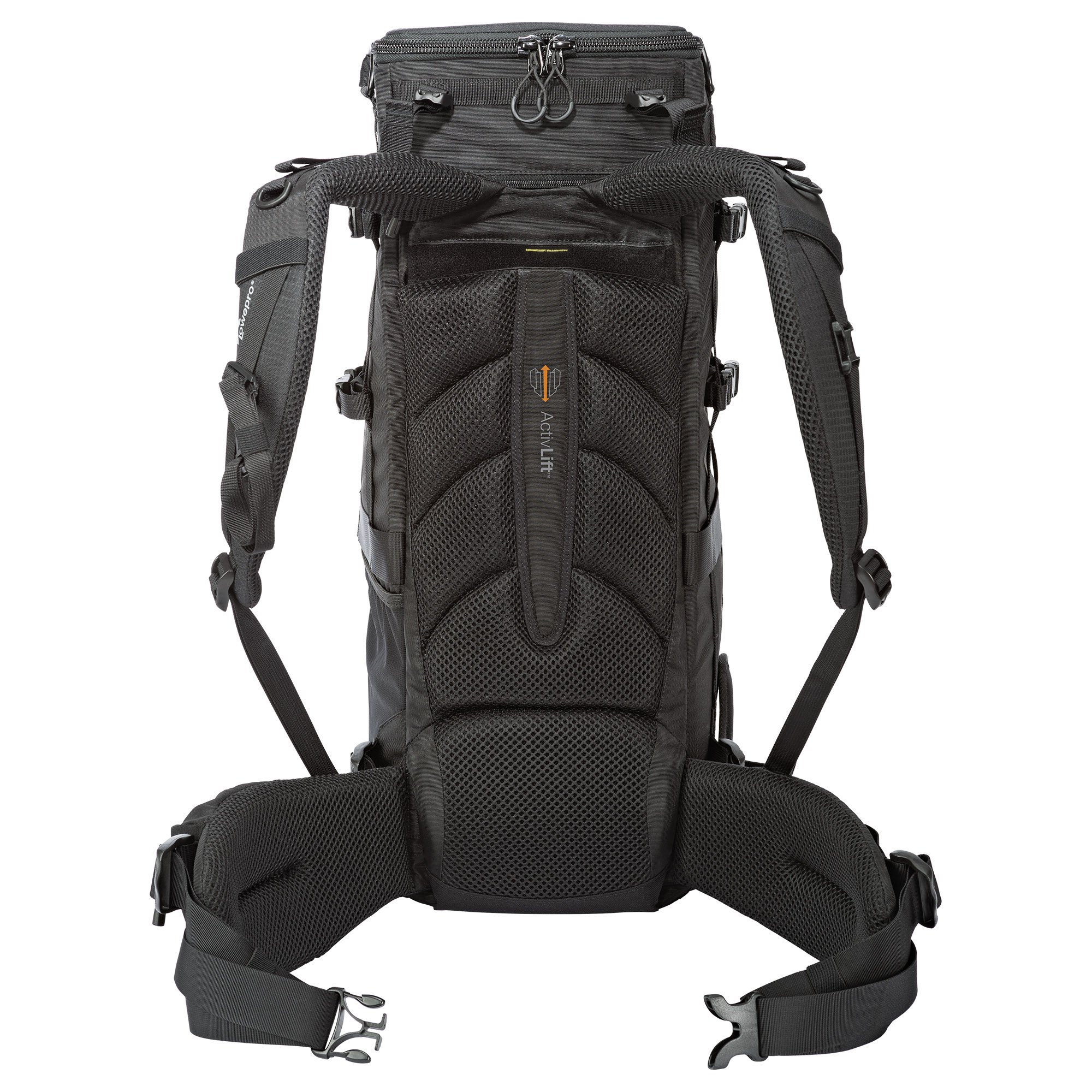 The main compartment can store a professional digital single lens reflex camera fitted with a 600 mm telephoto lens or a 800 mm telephoto lens without a camera attached.