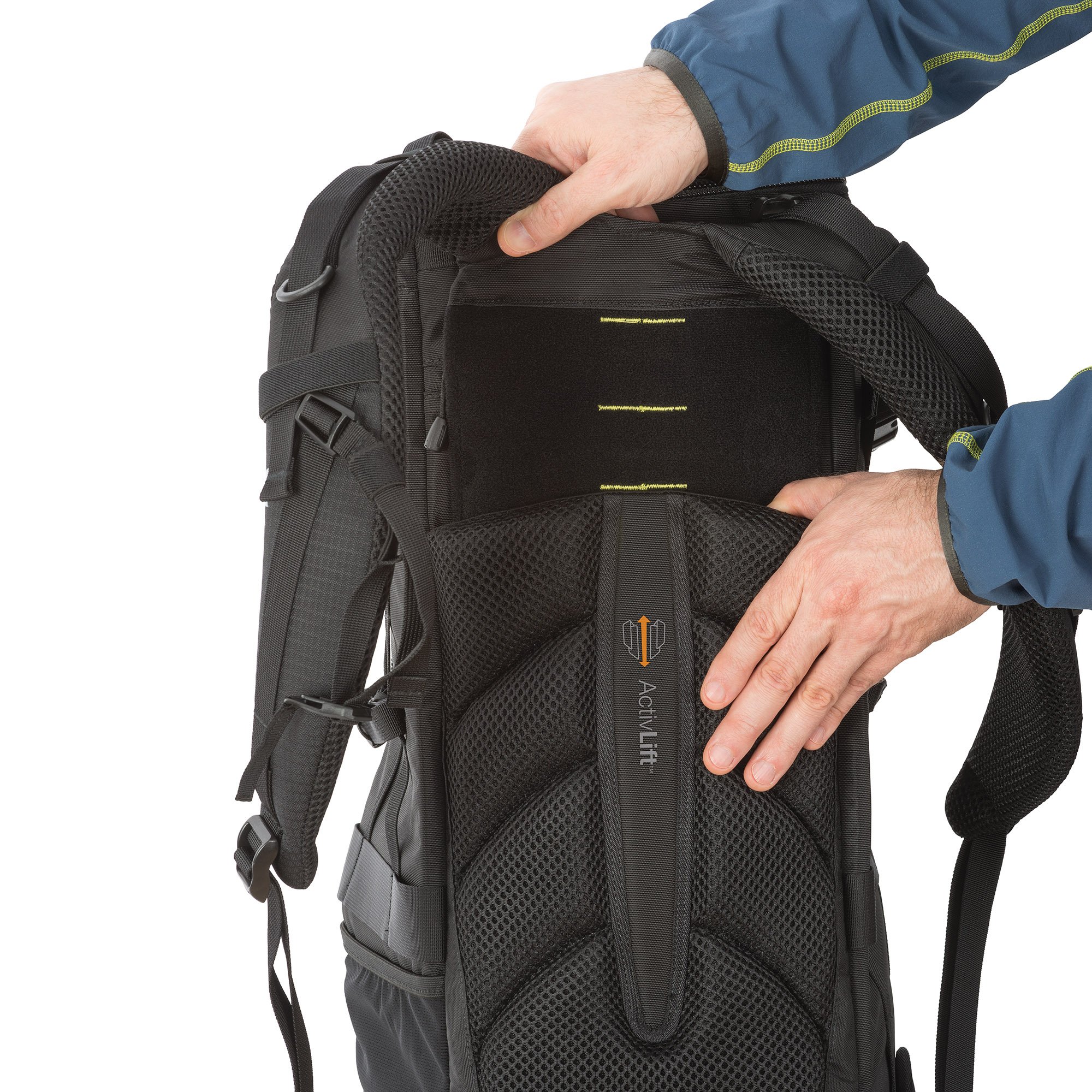 Adjustable active lift system The harness is made to follow the S-shaped curve of the back, and it is adjustable so that the load is dispersed also on the waist according to the body shape.