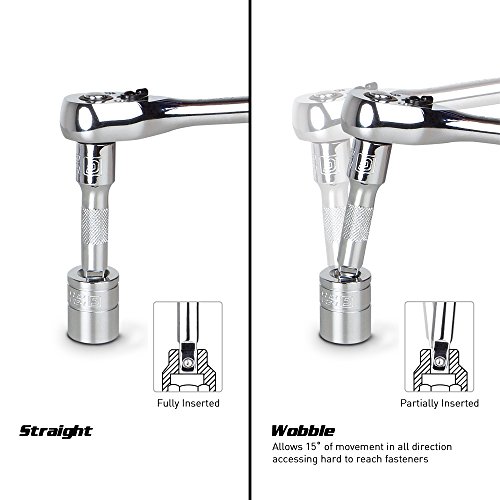 Wobble feature lets you reach and turn fasteners that can only be reached at an angle up to 15 degrees