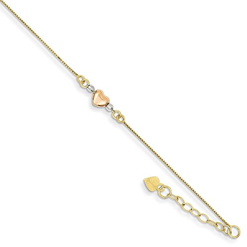 Solid 14k Gold Anklet Tri-Color Adjustable Puffed Heart 9" (4mm)