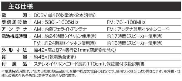 fk094igrjsスピーカー搭載の、高感度コンパクトラジオです操作もかんたんで、ステレオイヤホンを使用すればFMをステレオで聞けます光る同調ランプ付きサイズ個装サイズ:9×19×3cm重量個装重量:96g仕様保証期間:1年間製造国中国操作かんたん!!高感度コンパクトラジオです♪※スピーカー使用時はモノラル音声になりますスピーカー搭載の、高感度コンパクトラジオです操作もかんたんで、ステレオイヤホンを使用すればFMをステレオで聞けます光る同調ランプ付き