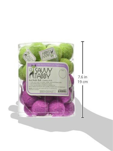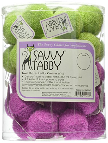 -. Feature : Soft knitted fabric on the exterior makes our Savvy Tabby Knit Rattle Balls twice as nice for feline claws / Balls come in two bright colors Packaged for retail in a 45-count canister / Each toy comes with a hangtag for easy scanning
