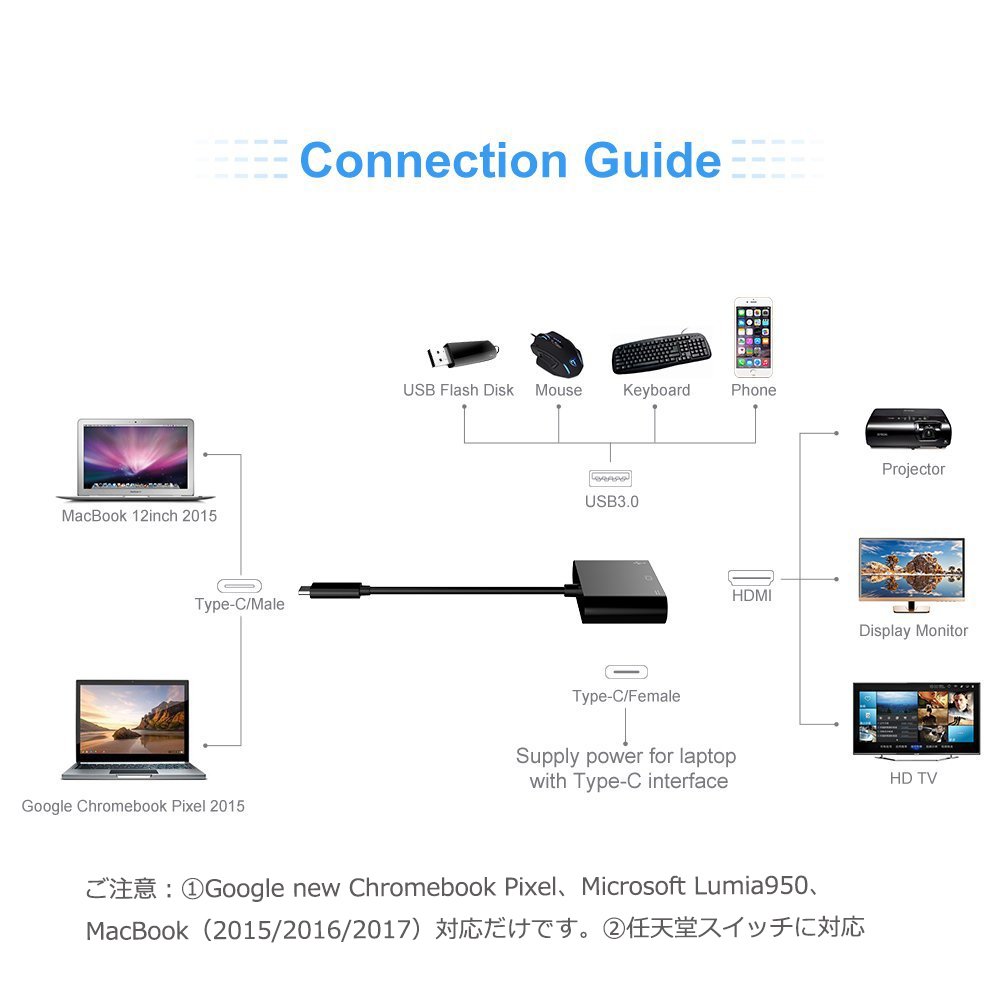 This product is USB 3.1 type-C to HDMI, USB 3.0, type-C / F conversion adapter.