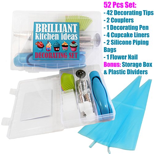 52 pcs VARIETY DECORATING SET - Make your mealtime FUN. This set has all you need in the kitchen. Save time on making beautiful, healthy creations. These are long-lasting, stainless steel, corrosion resistant, non-stick, non-toxic, dishwasher safe icing tips/dispenser ideal for kids, beginners and professionals alike. Set includes: 42 pcs decorating tips; 2 plastic couplers, 2 silicone piping bags, 4 silicone cupcake liners, 1 decorating pen, 1 flower nail, and storage box with plastic dividers.