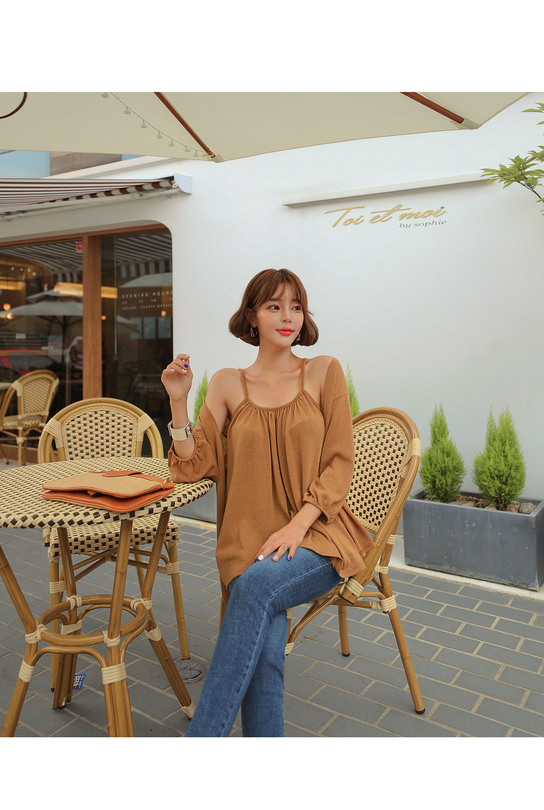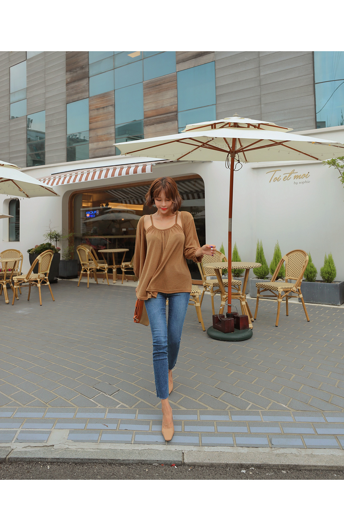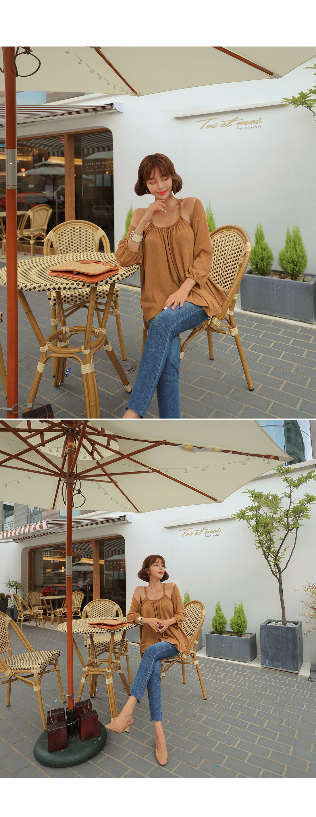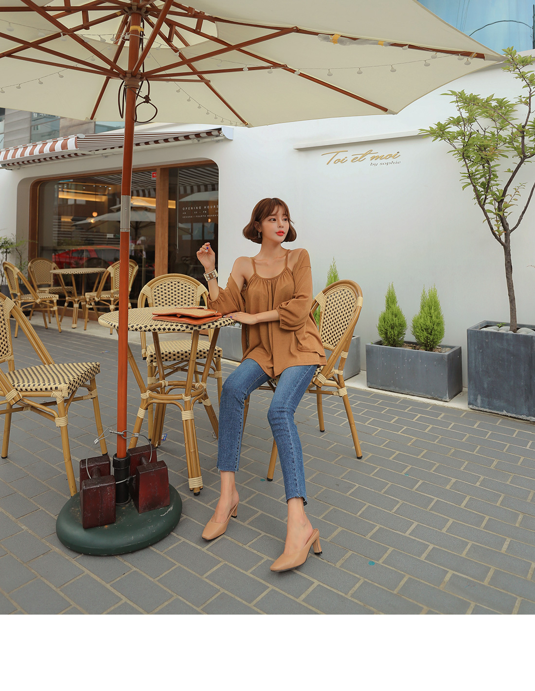 낮게 드롭된 숄더라인으로 여리여리한 느낌을 더해주었으며