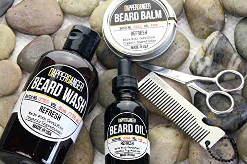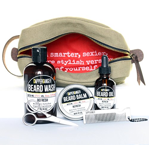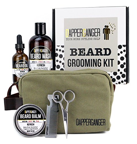 Studio : DapperGanger Publisher : DapperGanger Binding : Health and Beauty Product Description If you want to rest assured that our beard kit will perform and rid you of dandruff and split ends, maintain your beard for a much longer life cycle then other brands, smell delicious having people compliment you daily... then this is the most important professional beard kit you'll ever purchase! DapperGanger helps every man make their beard or mustache look boss and carry all your beard supplies wherever you stay or go in no time flat. Don't miss this opportunity to maintain your beard for a much longer life cycle then other sets. ! - Order Now! Our Top Rated Beard Kit includes: 2 oz Oil 2oz Conditioner Wax Balm 8oz Beard Shampoo Scented Face Wash unique metal Comb Bottle Opener on a Keychain and Quality Stainless Steel trimming Scissors. This complete package comes with awesome canvas and vegan leather travel toiletry organizer bag with a funky inside liner that is sure to grab your attention! Our gentlemens toiletry case alone is worth over 30. You will love this beard grow shaping starter set ! These are premium non cheap products Made Honest With Certified Organic Ingredients All Natural. Our products are Made In The USA and with the utmost care. Great to use if you have sensitive skin a great groom treatment for all facial hair types american or african . Our gentlemans scent is light and subtle and unified across all products. Hints of lemongrass mint and rosemary offer a spa like refreshing scent that won't overpower or offend. We called it Refresh simply because it's refreshing! Beard oil and balm will condition your beard making it softer to the touch and more brilliant acting as a good combo moisturizer and follicle growing booster. Using our oils and tools helps to relieve common male beard itch and will help eliminate that dull mangy long unkempt beard. Comes packaged in a black gift box. Its the jack of all gifts, prime birthday gifts, stocking stuffer, fathers day, hipster, caveman. Join our club! Envision a better version of yourself! 0