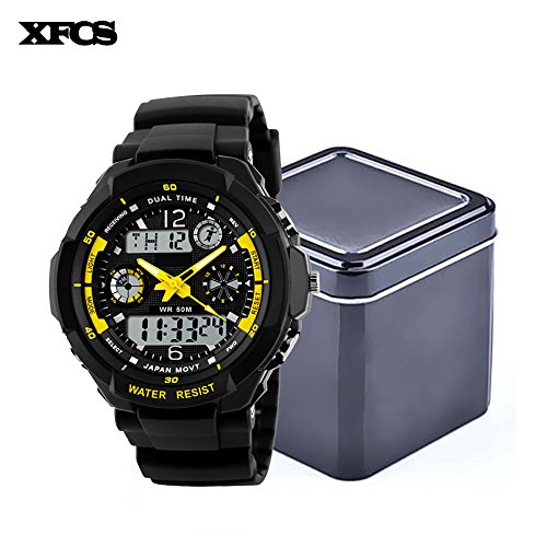 -. Feature : 164FT WATERPROOF: 164 ft waterproof (50 M) - 5ATM water resistant. NOTE: please DO NOT press any buttons in the water. / DUAL DIAL TWO TIMEZONE: analog and digital dual dial support two different timezone. Shock resistant, stop watch, military 12H/24H time, and LED back light functions make it perfect for all kind of sport and daily use. / COMFORT with FASHION: silicon rubber watch band with the large dual dial design make it comfortable to wear and lead you to edge sport fashion. Perfect for both indoor and outdoor activities. / Japan original installation import pointer quartz movement. / Water-resistant to 50M.