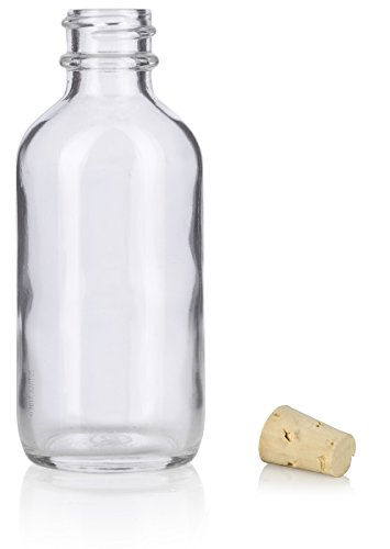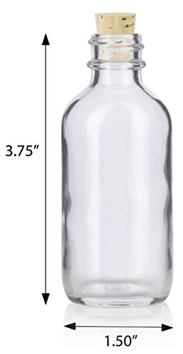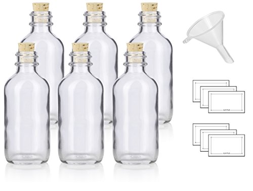 2 oz Clear Glass Boston Round Bottle with Cork Stopper Closure (6 Pack) + Funnel and Labels