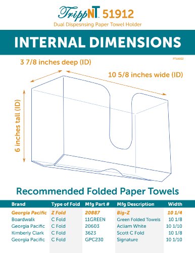 TrippNT's 51912 Dual Dispensing Paper Towel Holder is a wall mountable, durable and unique paper towel holder made from industrial strength PETG plastic which allows you to pull paper towels one a time from the bottom or take a handful from the top. Do not be fooled by its light weight. PETG is a tough, strong, industrial plastic which will stand up to years of service. It holds a 150 count stack of Z-fold, C-fold or multi-fold paper towels. The Dual Dispensing Paper Towel Holder has the durability to stand up to heavy hospital traffic, factory toughness and still looks great in your home. It installs quickly and securely with included hardware and keyholes in back. Outer dimensions measure 10 7/8 x 6 1/2 x 4 1/4 inches (W x H x D). TrippNT is the world leader in laboratory storage products and manufactures storage products, dispensers, carts, workstations, and shields for all applications. The company, founded in 1993, is headquartered in Kansas City, MO.