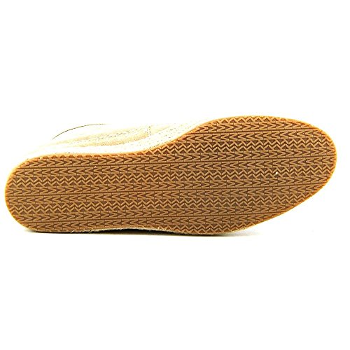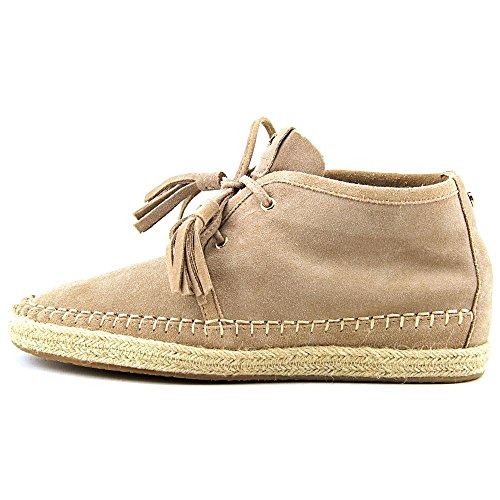 Lace-up front; tassel ties. Whipstitched trim around jute midsole.