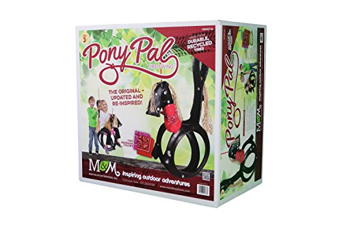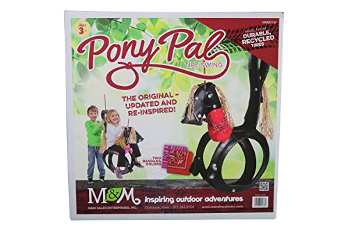 A re-inspired classic. M&M's horse tire swing is a recycled, repurposed tire made into the cutest pony in the field. Tan mane and tail keep this pony neutral while the included pink and red bandana let your rider customize their pony as they wish. 175 lb. weight capacity. 3 yrs.+ age rated. Trademarked PVC stabilizer bar and recessed seat make it easy for riders to safely saddle up and swing. Just like a real pony, this swing can withstand the elements. As tough as a tire and with UV -resistant rope this swing will be around the stable for years.Feature