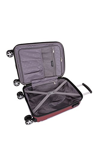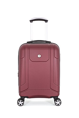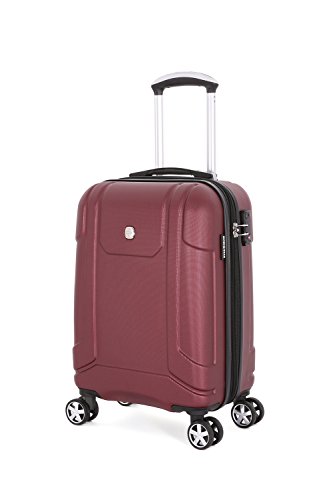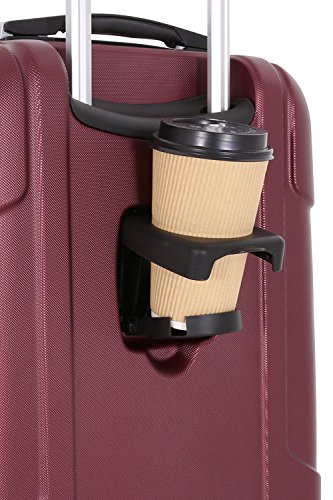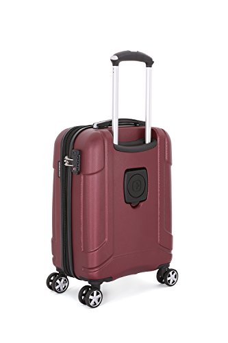 Product Description19" burgundy SwissGear 8 wheel spinner carry-on with retractable cup holder on back side of luggage0